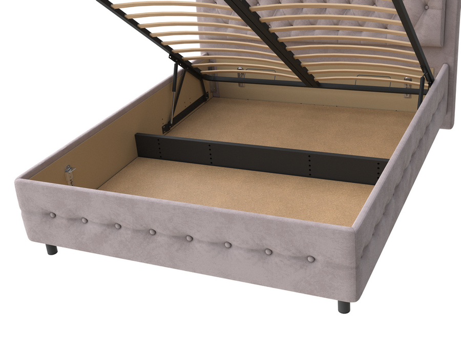 Основание оснащено подъемным механизмом, под которым расположена вместительная ниша, где можно хранить постельное белье, одежду и прочие спальные принадлежности.