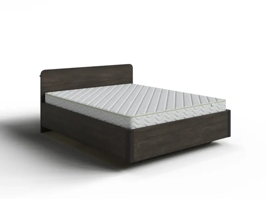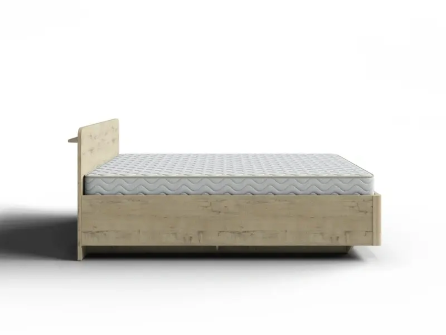 Кровать Minima с низкой спинкой и полкой позади нее изготавливается из ЛДСП.